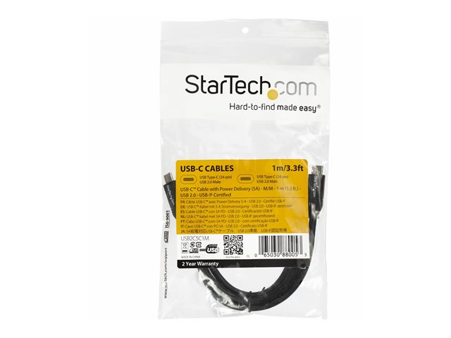 StarTech.com Câble USB-C vers USB-C avec Power Delivery 5A de 1 m - Cordon USB 2.0 Type-C certifié USB-IF - Noir - Câble USB - 24 pin USB-C (M) pour 24 pin USB-C (M) - Thunderbolt 3 / USB 2.0 - 5 A - 1 m - noir