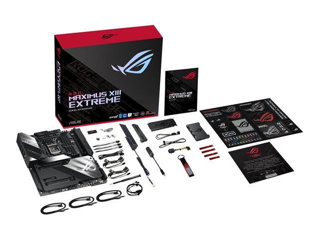 | Accessoires inclus | Autocollants pour ventilateurs ROG, câble d'extension de bande LED RGB (RGBW), 3 câbles de thermistance, support VGA ROG, carte de remerciement ROG, carte d'extension ROG DIMM.2 avec radiateur, tournevis, autocollant de plaque de logo ROG, Q-Connector, chaîne de clés ROG, antenne mobile ASUS Wi-Fi, lecteur USB, 1 à 3 câbles diviseurs de LED ARGB, 1 à 4 câbles répartiteurs de ventilateur, ROG Fan Controller, ROG CLAVIS DAC |