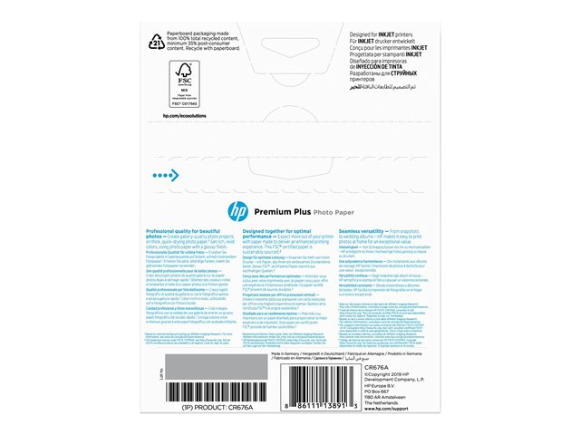 HP Premium Plus Photo Paper - Brillant - 130 x 180 mm - 300 g/m² - 20 feuille(s) papier photo - pour Deskjet 2136, 2622, 36XX; Officejet 52XX, 6000, 68XX, 80XX; Photosmart B110, Wireless B110 CR676A