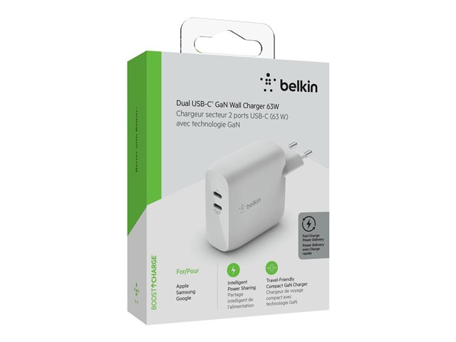 Belkin BOOST CHARGE - Adaptateur secteur - 68 Watt - 3 A - Fast Charge - 2 connecteurs de sortie (24 pin USB-C) - blanc